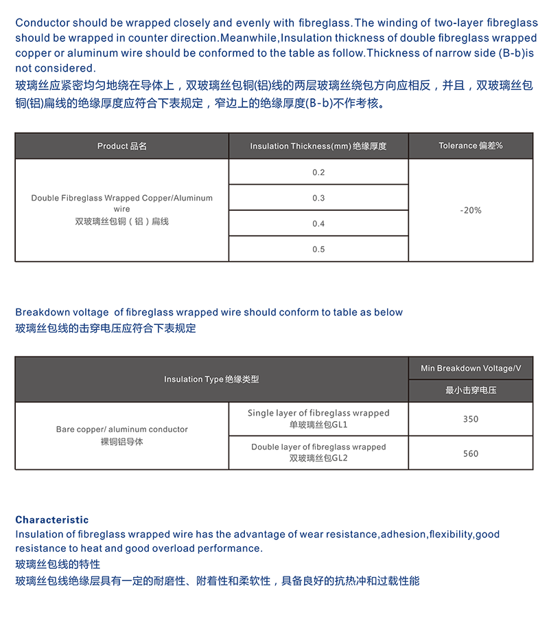 玻璃丝包线是按客户要求,在铜(铝)导体上匀整绕包1-2层无碱玻璃纤维,配所需耐温指数及相容性的绝缘漆进行浸渍、烘焙处理,使玻璃纤维之间,玻璃纤维与导体之间粘结成一整体的绕组线,目前该类产品的耐温指数有130、155、180三个等级,绝缘厚度一般有20、30、40、50四个等级。该产品用于变压器、电磁铁、电焊机或其它类似电器设备产品绕组。经挤压工艺生产的电工裸铜(铝)导线是生产玻璃丝包铜(铝)线所需的材料。也可以定制玻璃丝加膜包,或者玻璃丝加漆包的绝缘组合。