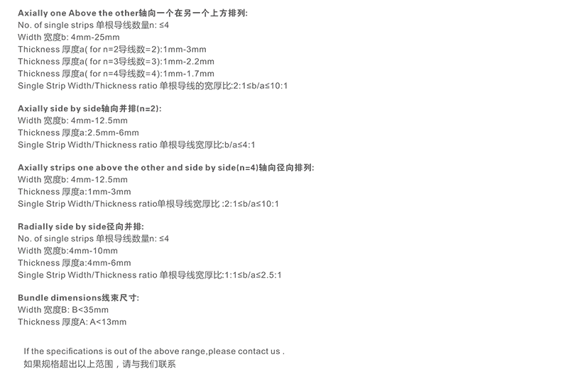 推荐扁线导体尺寸:厚度: 1.00~12.00 mm; 宽度: 3.00~25.00 mm 宽厚比: ≤20